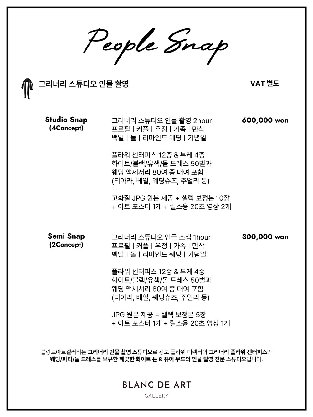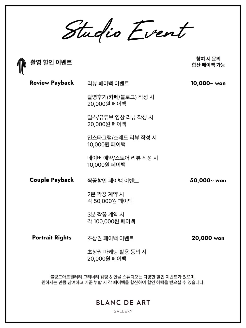 - 스냅/촬영 및 돌잔치/웨딩행사는 계약 후 해지 시, 촬영은 5만원, 행사는 10만원의 위약금이 발생합니다.